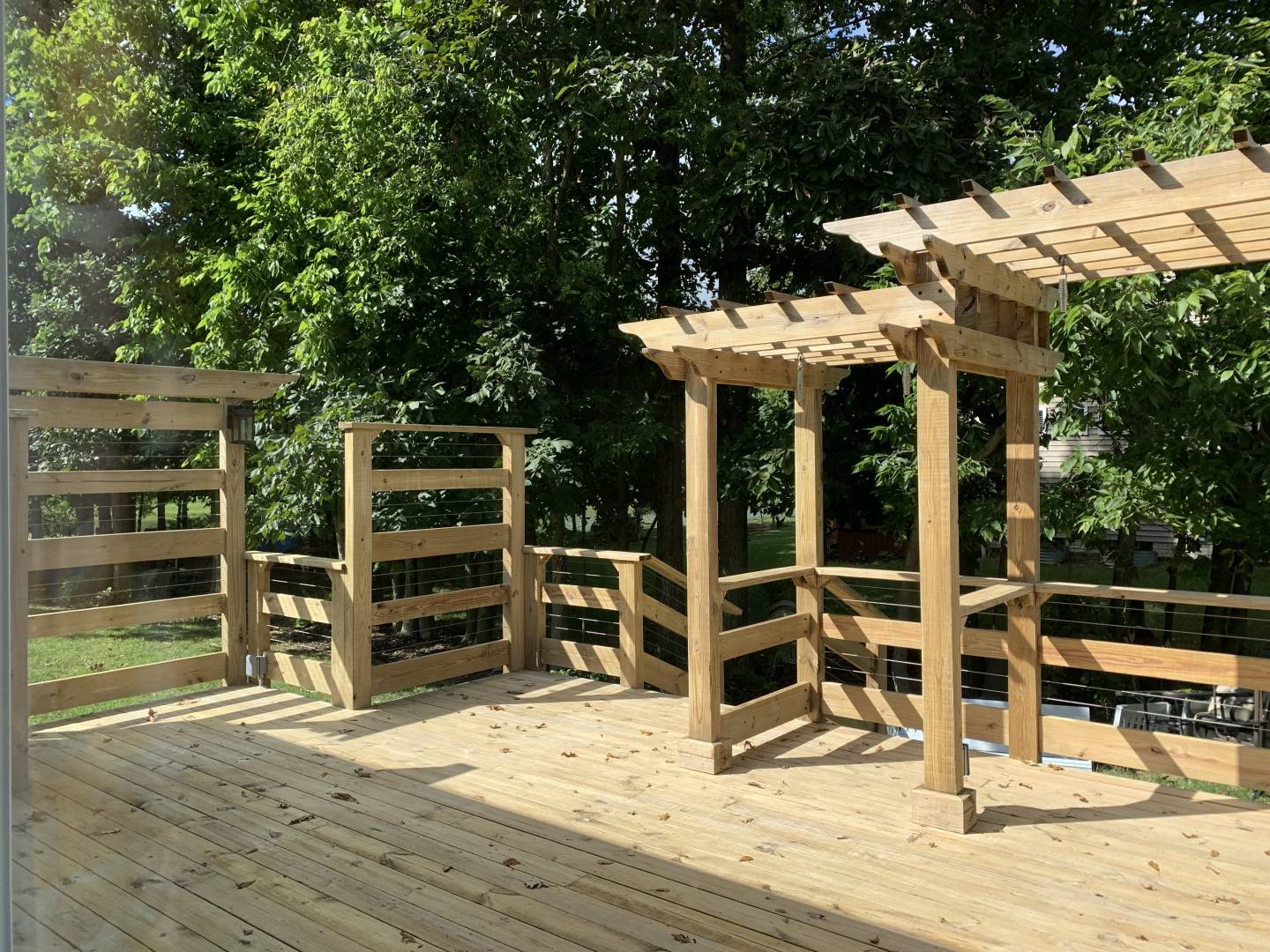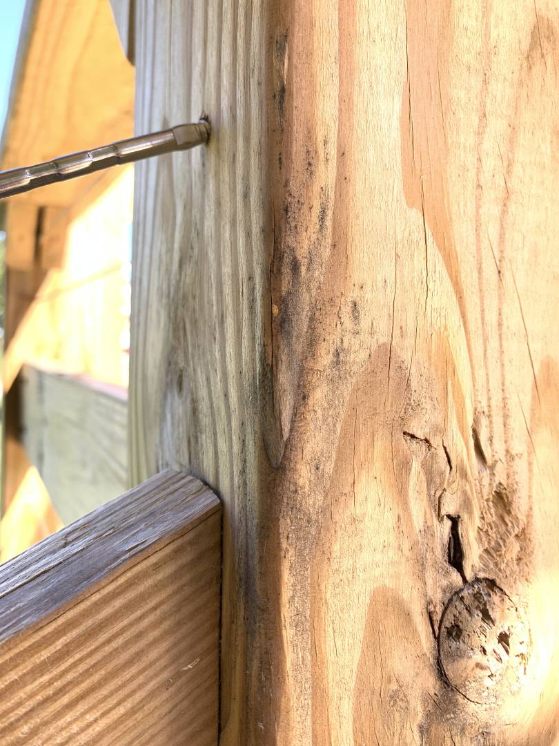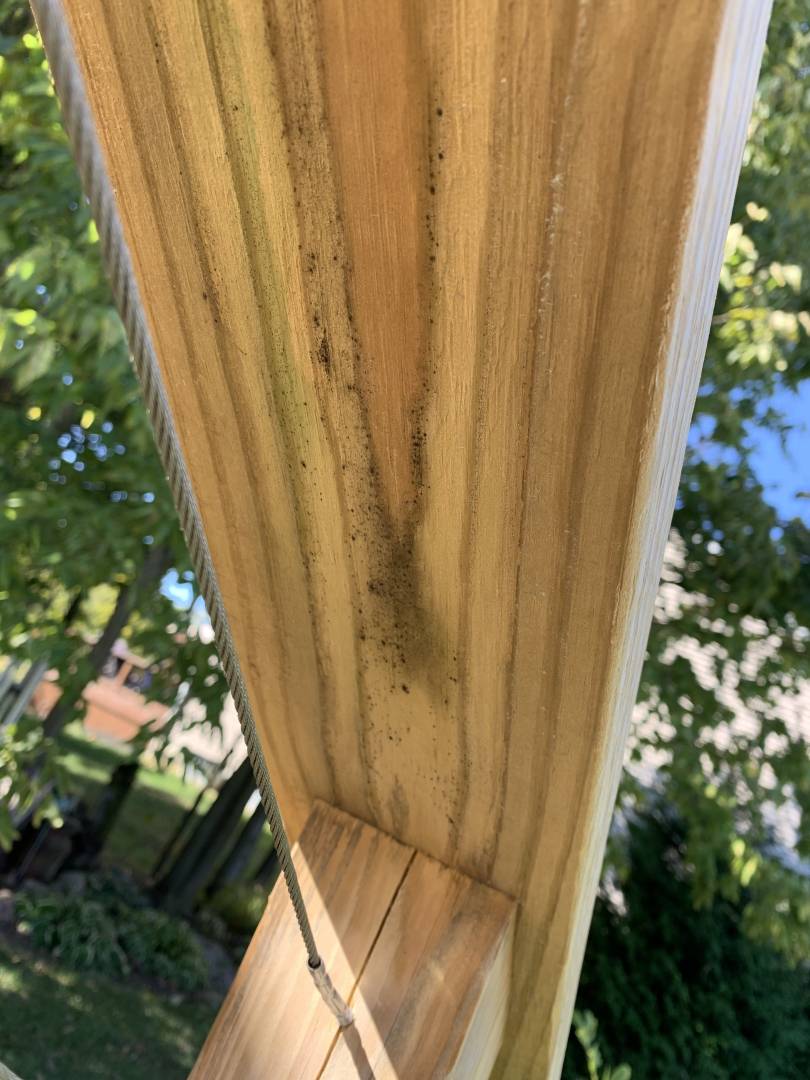 pine deck built. Pergola, metal skirting, wire cables. It sat from August 2021 to June 2022 before we could get a contractor to agree to come out to stain. I bought RAD cleaner/brighter and was very careful to point out instructions. Well the contractor came in and used RAD but with very aggressive pressure washing and knocked knots out, split and badly splintered wood, left corners barely hanging on, and yes furring on every board. I’m not sure the brightener was used right because while some boards now look like toothpicks, some are darker than they were.