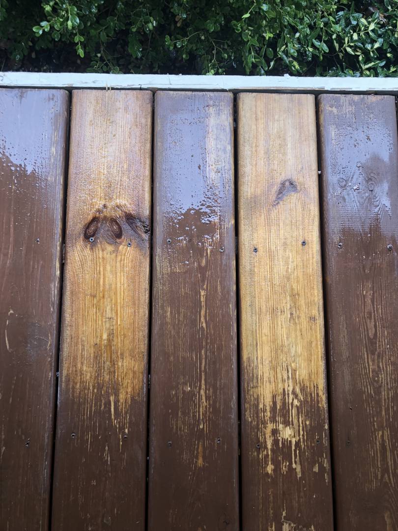 @administrator Hello Here is RAD Paintstrip on the BEHR transparent stain for 1 hour, covered and misted.  It is is the low 80s here and humidity around 79%  Left side thin application about 2 mil.  Right side more like 1/8  inch.  i did have to use putty knife and stiff then wire brush then a 1400psi power washer to accomplish this.  Do you think the right side is considered enough removed? And how long should I let it dwell?