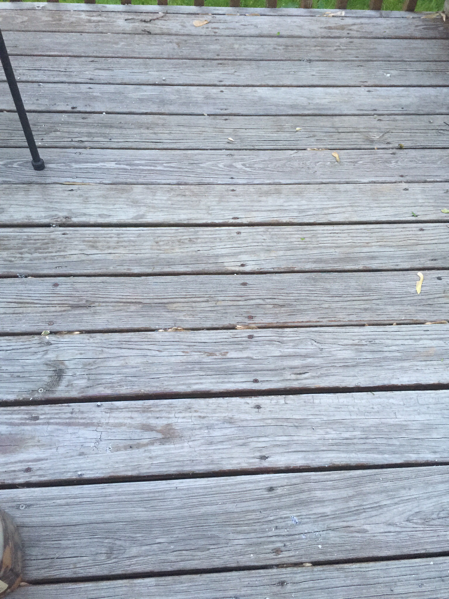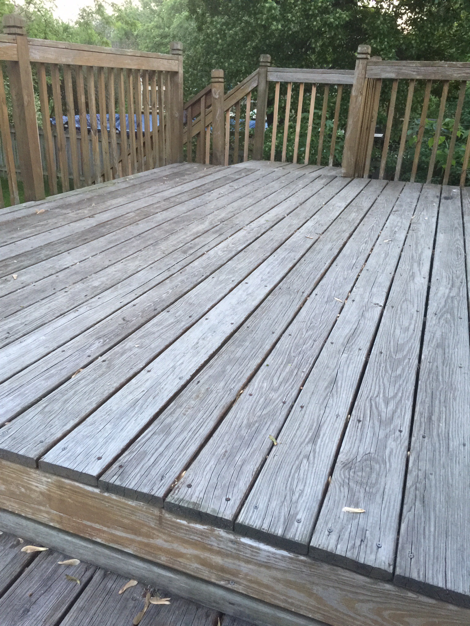 We live 30 miles west of Chicago. We think the deck is original to the house, maybe 30 yrs old. It is a southern exposure with partial shade at different points during the day. We have no idea what type of wood it is. It's very grey with some cracks and splinters. I really need some help, TIA!