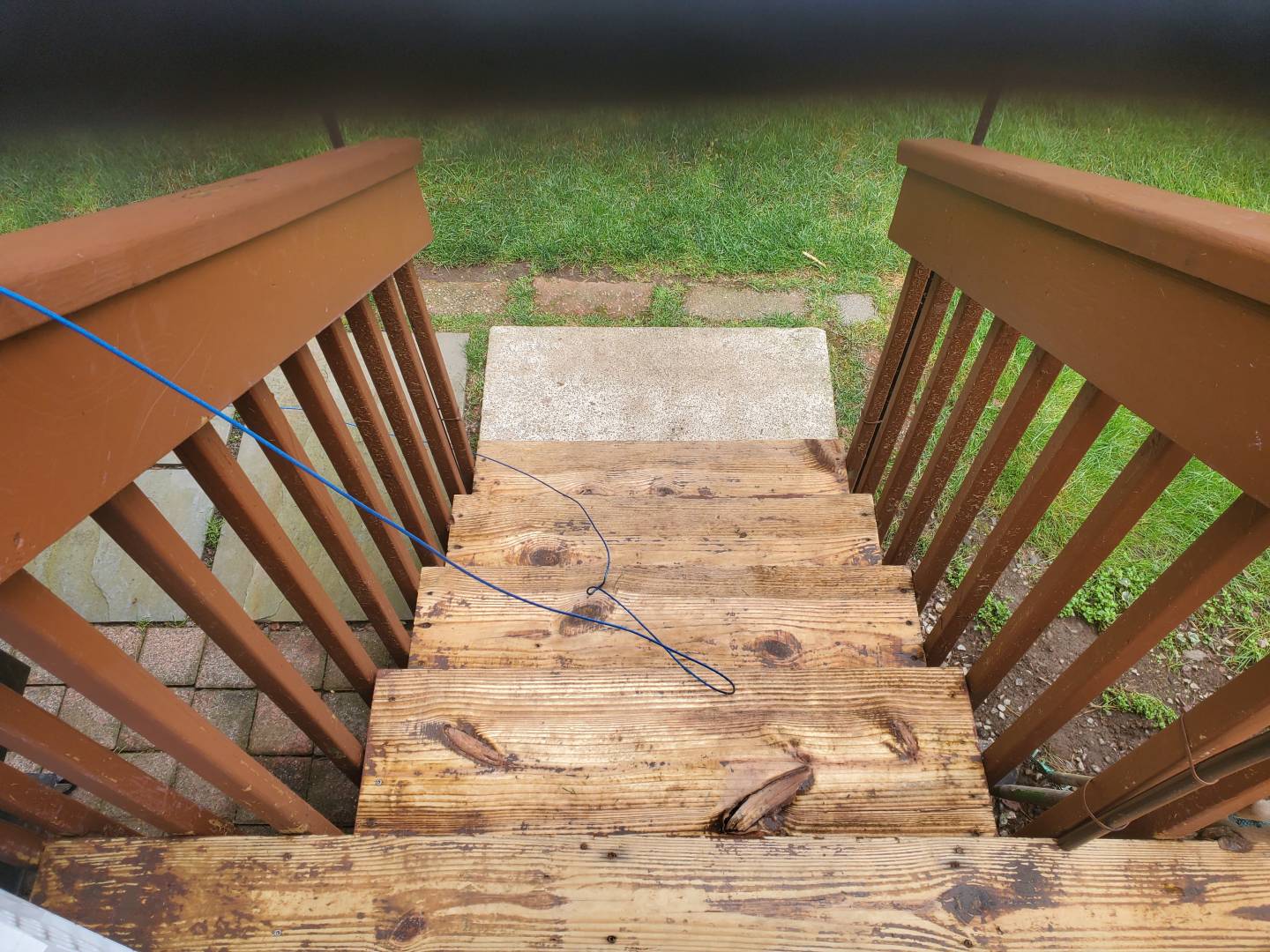 So I have removed most of the solid stain using the RAD. There are a few tough spots that need either more RAD or sanding.I choose to leave railings and spindles solid as they are mostly good. I`m leaving the 12 back stairs as no one uses them or sees them.Stripped the 3 to the yard. I had to replace a rotted floor board,and handrail.I was not able to complete this yet as a few personal issues arose. But I`m back at it now. I ordered the cleaner and brightener and a large brush. I think I need a rented floor sander ,and borrowed power hand sander. I think the power washer beat the wood up pretty good in a few spots. Tried to back off , but not great removal results ,so hoping sanding will help Alot! A few questions as I proceed: Should I use RAD on the stubborn spots or go to floor, hand sanding? How to I deal with the new replacement PT boards that really stand out? Can sanding or brightening help match? I think with the age and condition I will order oil based semi transparent in a mid or darker shade.Any ideas on that? Should I plan on waiting for dry warm weather for a 2-3 days first and try to sand and stain ASAP after ?I will read up more as its been awhile since I was working on this. Its been raining on and off . Despite covering the vinyl siding with plastic the power washer did get RAD spray onto it and I have some white speckles I belive are the gray color bleached out on the siding by the RAD.Not much I can do except replace siding I think? Didn`t think it would go up that far! Thanks for your help ,I`m learning alot and getting closer to finishing.. I hope