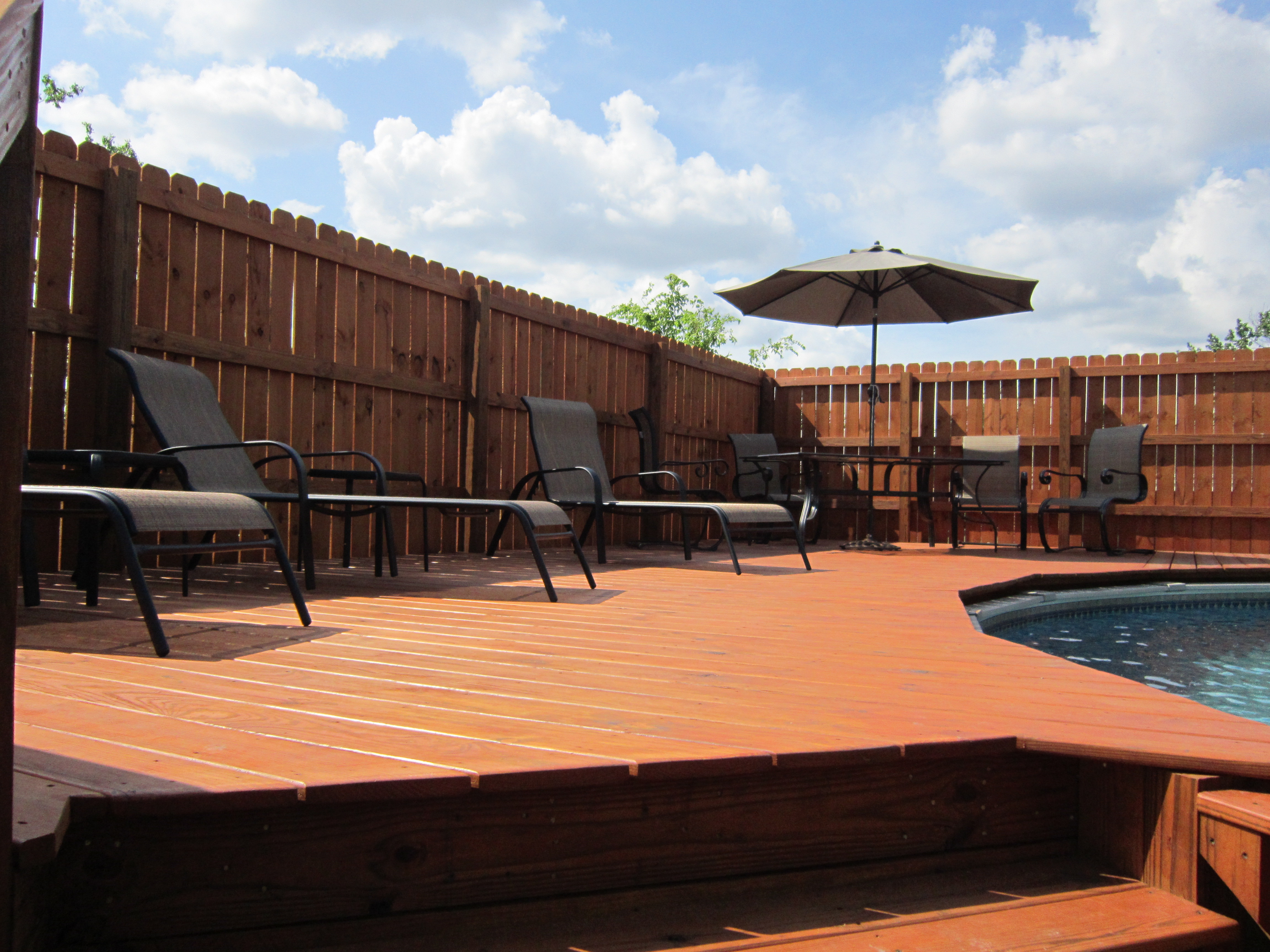 After recommendations from this site (and others) I went with TWP for my deck. I am very pleased with the results. Being a newbie stainer, I made a lot of mistakes. From underestimating my deck and fence area to sanding my deck with too fine a sandpaper, 60 grit being the recommended max, (I finished with 150 😛 ),and then not getting everything covered like they recommended and having stain go everywhere. It even bled through the tarp covering my pool and stained some of the railings.